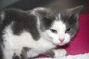 Farbe: grau-weißDer Kater stammt von einer unkontrollierten Vermehrung von einem Hof in Untereisesheim und kam am 10.04.2022 ins Tierheim. Er ist den Umgang mit Menschen bislang nicht gewöhnt.