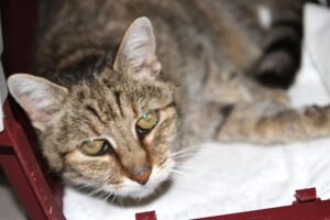 Farbe: getigertDie Katze kam nass, abgemagert und hungrig am 09.09.2023 als Fundtier aus Schozach ins Tierheim.