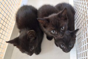 Farbe: schwarzDie drei etwa 7 Wochen alten Katzenkinder wurden am 11.09.2023 vormittags vor dem Tierheimtor in einem Karton ausgesetzt gefunden.
