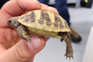 Geburtsdatum: unbekanntDie kleine Landschildkröte wurde am 07.09.2024 beim Radfahren auf dem Feldweg in Lehrensteinsfeld zwischen den Äpfeln krabbelnd gefunden.