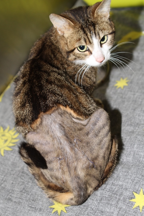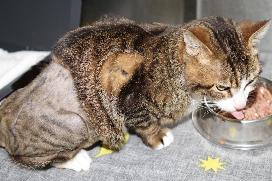 Der junge Kater lebte etwa einen Monat bei seiner Familie und wurde Mitte Mai nach einem Unfall mit einer beidseitigen Beckenfraktur operiert.