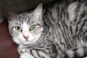 Farbe: grau-getigert mit weißDie Katze stammt von einer Streunermeldung aus Obergriesheim, wo sich seit letztem Jahr Katzen unkontrolliert vermehrt haben. Die Streuner tauchen immer wieder bei der Suche nach Futter am Feldrand und auf einer Terrasse auf. Odette konnte am 30.05.2025 gesichert werden.
