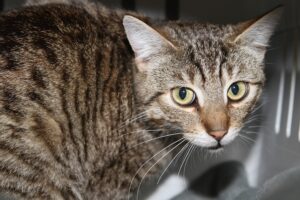 Farbe: getigertDer Kater stammt von einer Streunermeldung aus Obergriesheim, wo sich seit letztem Jahr Katzen unkontrolliert vermehrt haben. Die Streuner tauchen immer wieder bei der Suche nach Futter am Feldrand und auf einer Terrasse auf. Orion konnte am 31.05.2025 gesichert werden.