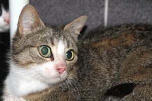 Farbe: getigert-weißDie Katzenmutter wurde uns als Streunerin in Ilsfeld-Auenstein gemeldet, wo sie gemeinsam mit ihren Kindern unter einem Container lebten. Am 20.06.2025 konnte sie eingefangen werden. An der gleichen Stelle wurde auch Kater Acolon – vermutlich der Vater der Kinder – gesichert.