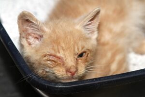 Der kleine Kater Ragnar befindet sich derzeit in tierärztlicher Behandlung. Auch seine Augen sind stark beeinträchtigt. Ob wir beide Augen retten können, ist aktuell noch unklar.