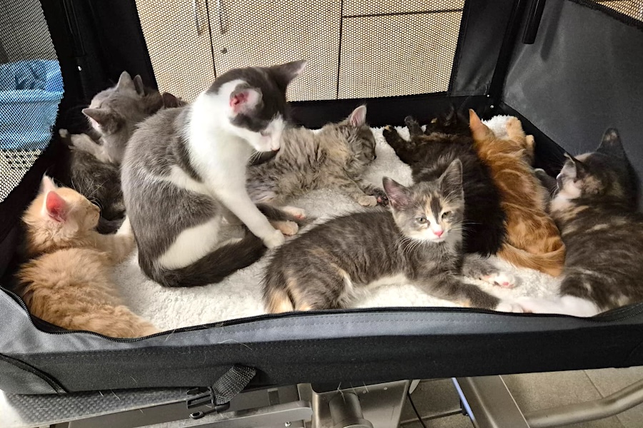 Katzenmutter Babka wurde am 09.07.2025 zusammen mit zwei weiteren Müttern und 12 Katzenkindern – darunter auch ihre eigenen – abgegeben.