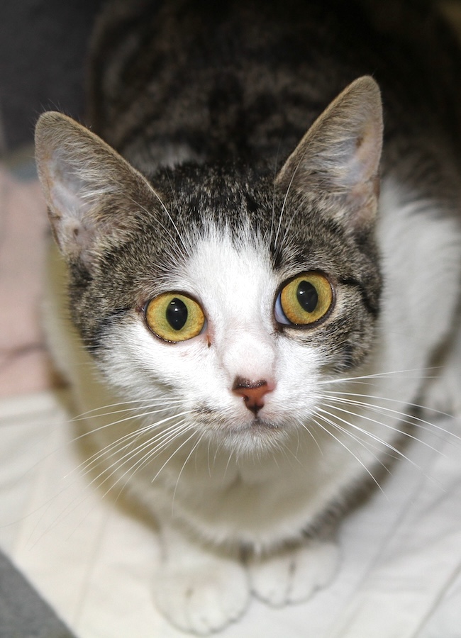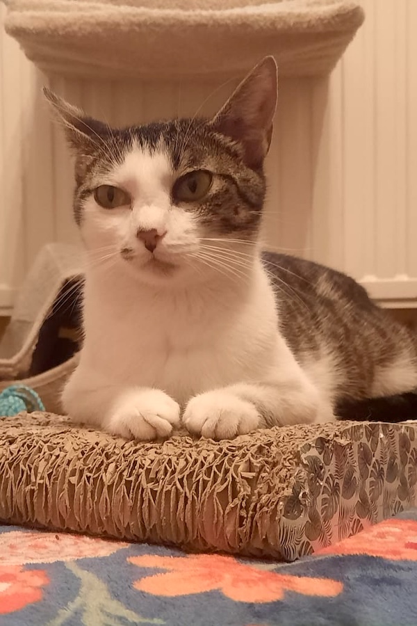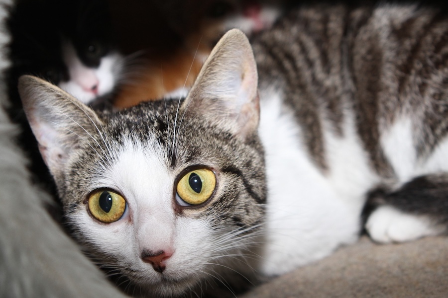 Gin musste ihre Kinder auf dem kalten Boden einer Werkshalle zur Welt bringen. Die Kleinen waren von Anfang an immer darauf bedacht, nicht „unter die Räder zu kommen“. Gin ist erstaunlicherweise sehr menschenbezogen und ein echtes Schnurr-Kommando auf vier Pfoten.