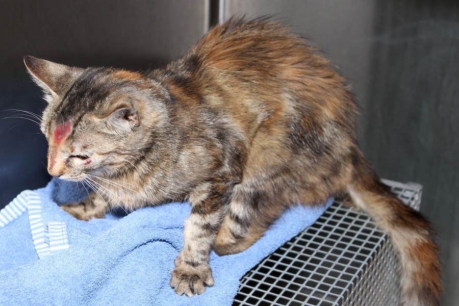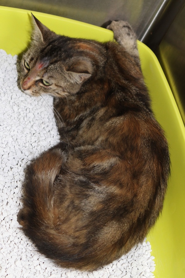 Gemma hat offensichtlich als Streunerin ums Überleben gekämpft. Sie hat eine schwere Verletzung davongetragen: ihr fehlt die komplette Hinterpfote, vermutlich durch einen Unfall oder eine ältere, unbehandelte Verletzung.