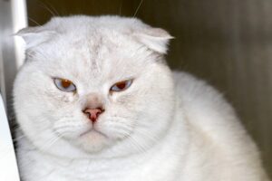 Farbe: weiß-grauDer Kater kam am 06.10.2025 als Fundkatze aus Heilbronn zu uns.Bei der Scottish Fold handelt es sich um eine sogenannte Qualzucht. Die charakteristisch nach unten gefalteten Ohren dieser Rasse entstehen durch einen gezielt angezüchteten Gendefekt, der den Knorpelaufbau beeinträchtigt. Diese genetische Veränderung betrifft jedoch nicht nur die Ohren, sondern kann auch Knorpel- und Knochenschäden an anderen Stellen des Körpers verursachen. Die Erkrankung nennt sich Osteochondrodysplasie (OCD) und kann zu chronischen Schmerzen und Bewegungseinschränkungen führen.