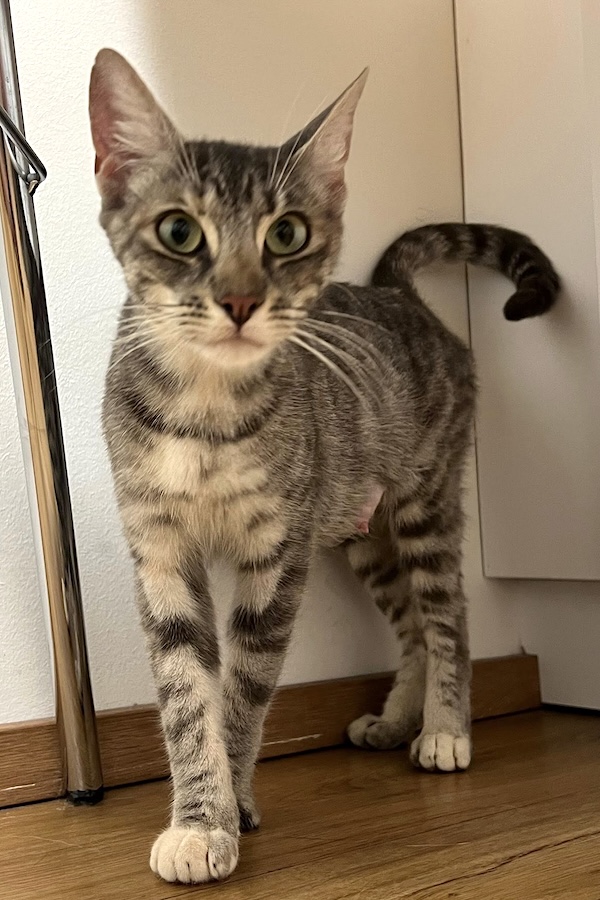 Die hungrige Katze mit sichtbarem Gesäuge wurde in Eppingen-Elsenz mehrmals täglich an einer Straße gesichtet, wo sie nach Futter suchte. Zwei Tage später – am 12.10.2025 – konnten ihre Kinder gefunden und die Familie gemeinsam im Tierheim untergebracht werden.