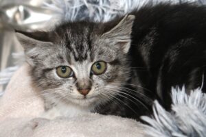 Farbe: getigert-weißDas Katzenkind wurde uns allein in einem Lager eines Einkaufzentrums in Heilbronn gemeldet und konnte am 17.10.2025 gesichert werden.