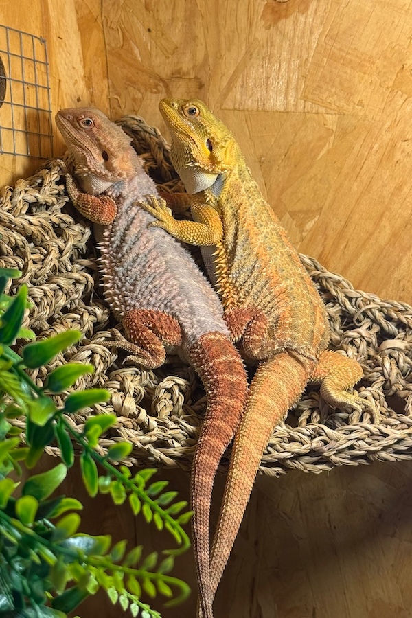 Die beiden etwa 9 Monate alten Geschwister Drago (gelb) und Sphinx (rot) wurden am 18.10.2025 bei uns abgegeben. Beide sind aktiv, fressen allerlei Insekten und auch gerne Grünfutter.