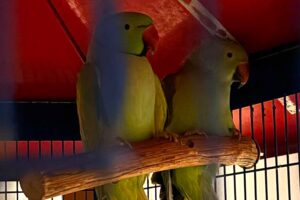 Die zwei “grünen Papapgeien” sind etwa 3 und 5 Jahre. Aktuell werden sie in einer Voliere in der Wohnung gehalten und sind eher scheu.