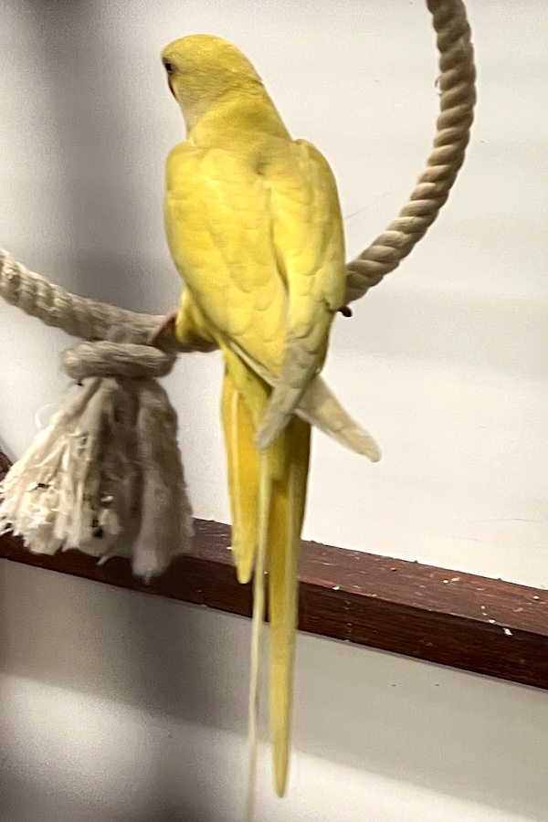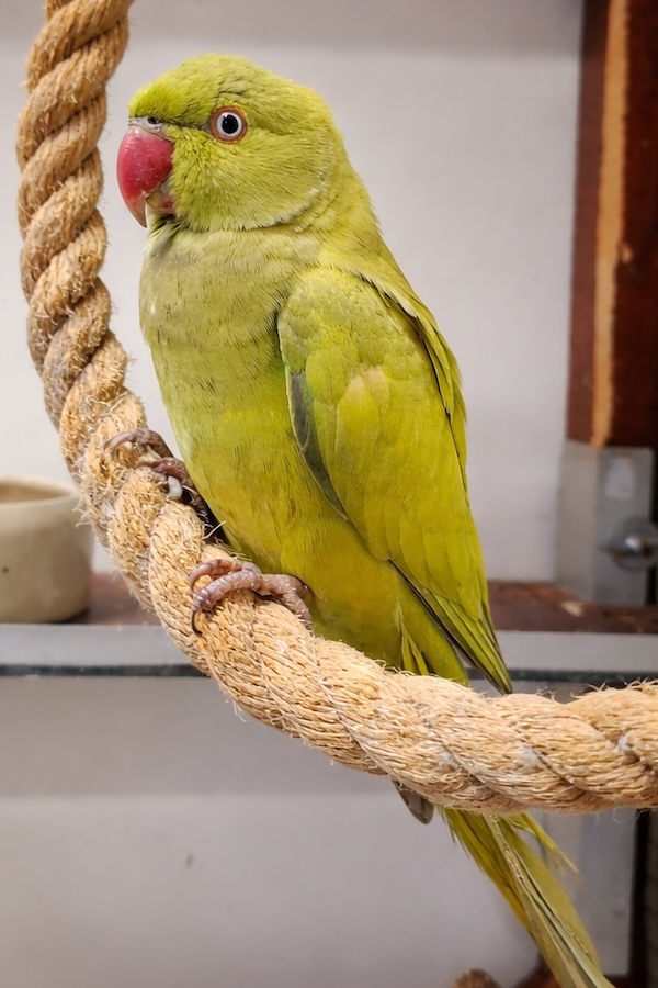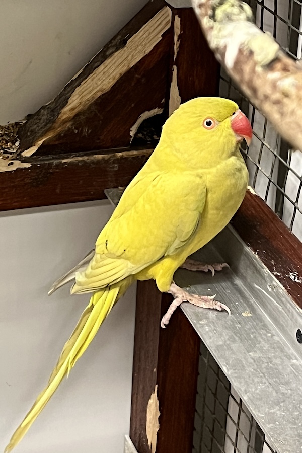 Der Halsbandsittich kam am 02.03.2026 als Fundtier aus Weinsberg zu uns. Er wurde vom Schornsteinfeger beim Reinigen aus einem Kamin geholt.