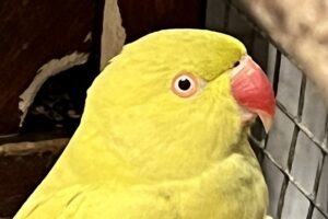Farbe: gelb-grünDer Halsbandsittich kam am 02.03.2026 als Fundtier aus Weinsberg zu uns. Er wurde vom Schornsteinfeger beim Reinigen aus einem Kamin geholt.