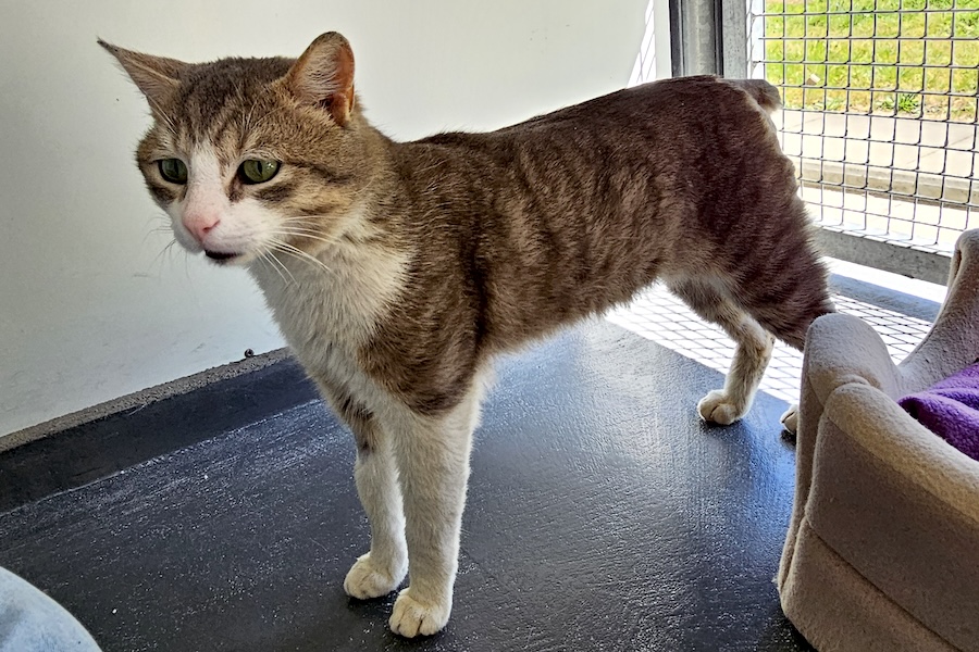 In der Tierklinik wurde bei Bob ein Schwanzabriss mit bereits nekrotischem Gewebe festgestellt, weshalb eine Amputation notwendig war. Der verbliebene Schwanz ist etwa 5 cm lang, wurde vernäht und muss nun langsam verheilen.